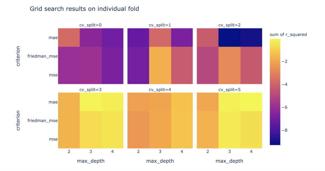 fig_hmap = px.density_heatmap( melted, x="max_depth", y='criterion', histfunc="sum", z="r_squared", title='Grid search results on individual fold', hover_data=['mean_fit_time'], facet_col="cv_split", facet_col_wrap=3, labels={'mean_test_score': "mean_r_squared"})