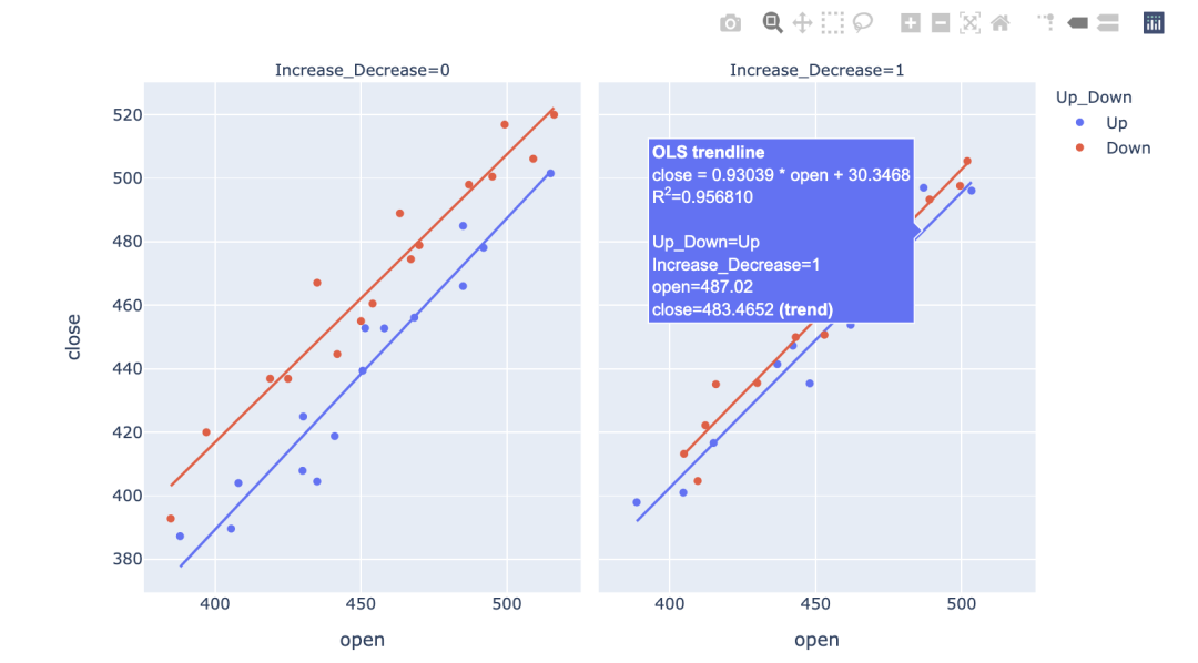 fig=px.scatter(df, x="open", y="close", facet_col="Increase_Decrease", color="Up_Down", trendline="ols")