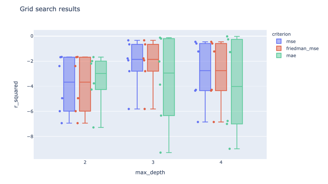 fig_box = px.box( melted, x='max_depth', y='r_squared', title='Grid search results ', hover_data=['mean_fit_time'], points='all', color="criterion", hover_name='cv_split', labels={'mean_test_score': "mean_r_squared"})