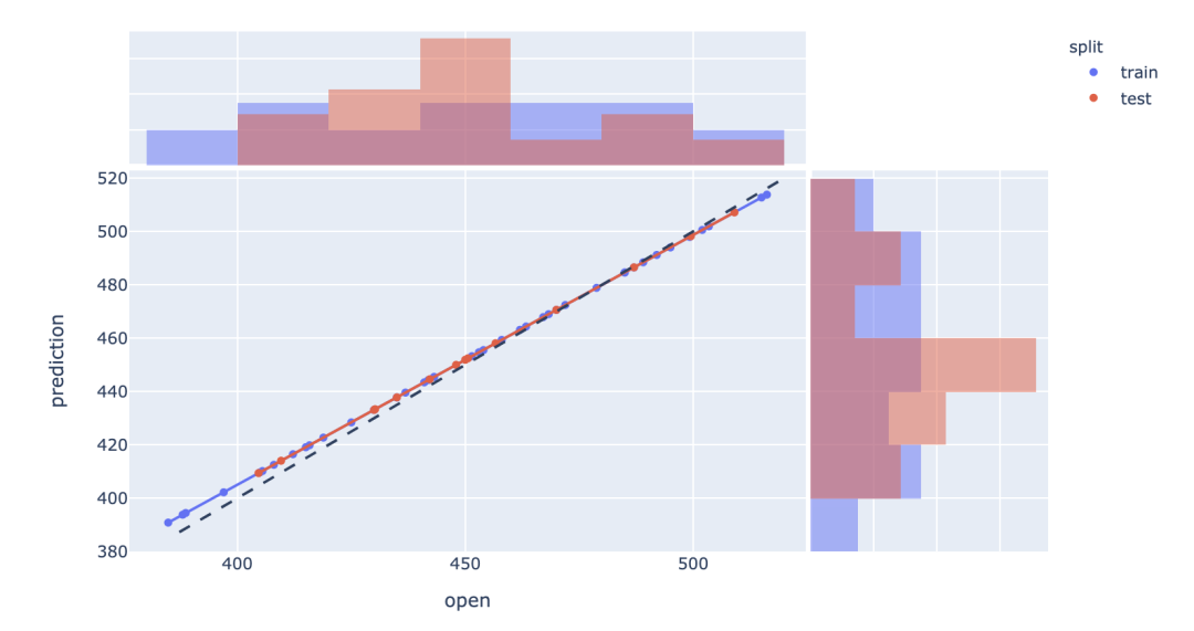 fig = px.scatter( df, x='open', y='prediction', marginal_x='histogram', marginal_y='histogram', color='split', trendline='ols')