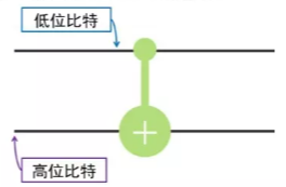 含实点的路线对应的量子比特称为控制比特(control qubit),含+号的路线对应的量子比特为目标比特(target qubit)。