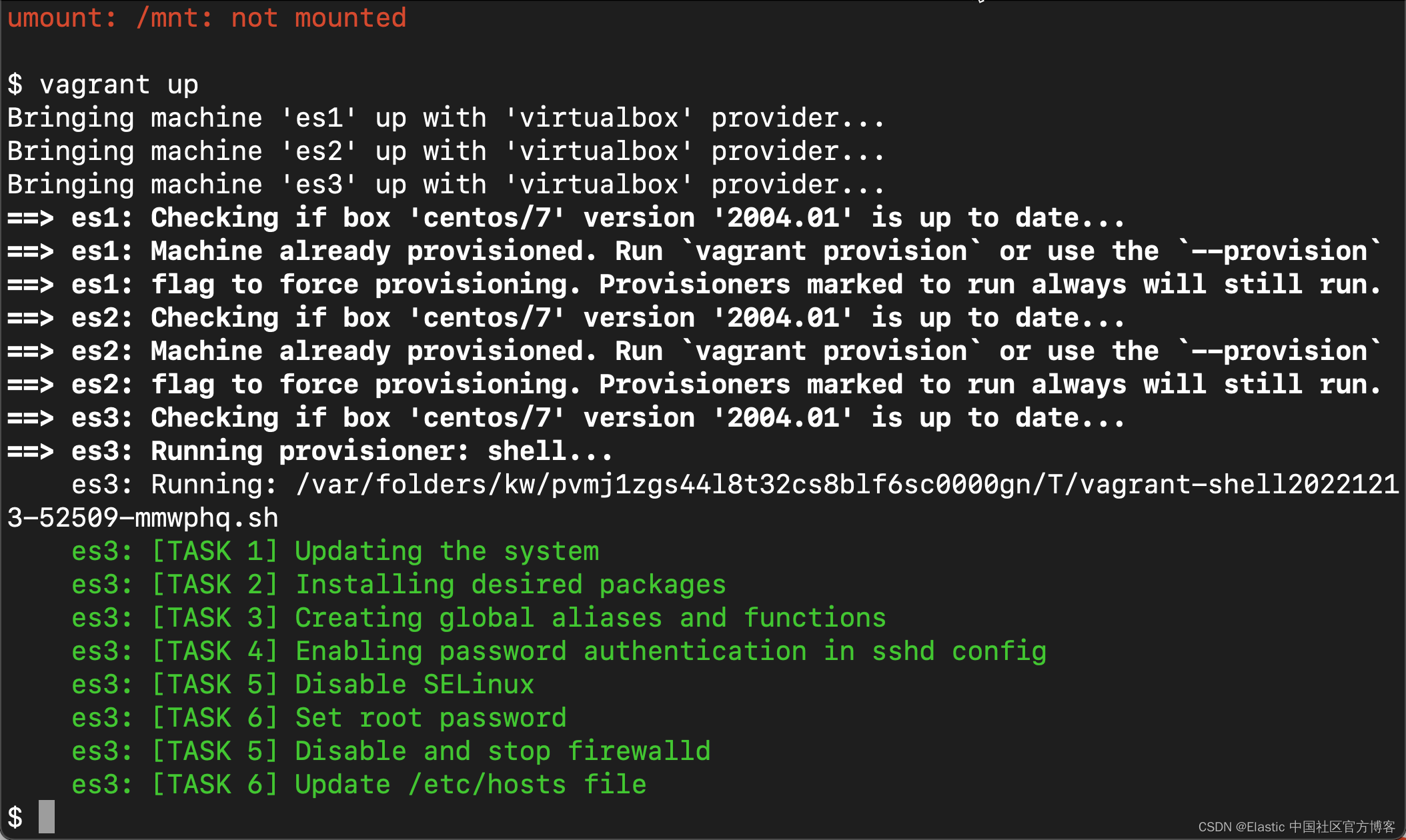 如上所示,在更新完系统后,上面的错误信息就不见了。我们需要为 es2 及 es3 重复这个步骤。 等全部安装完毕后,我们可以使用如下的命令来查看:
