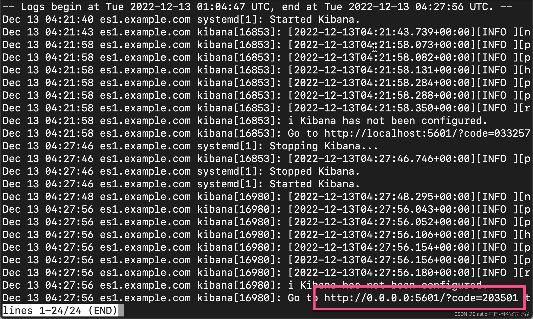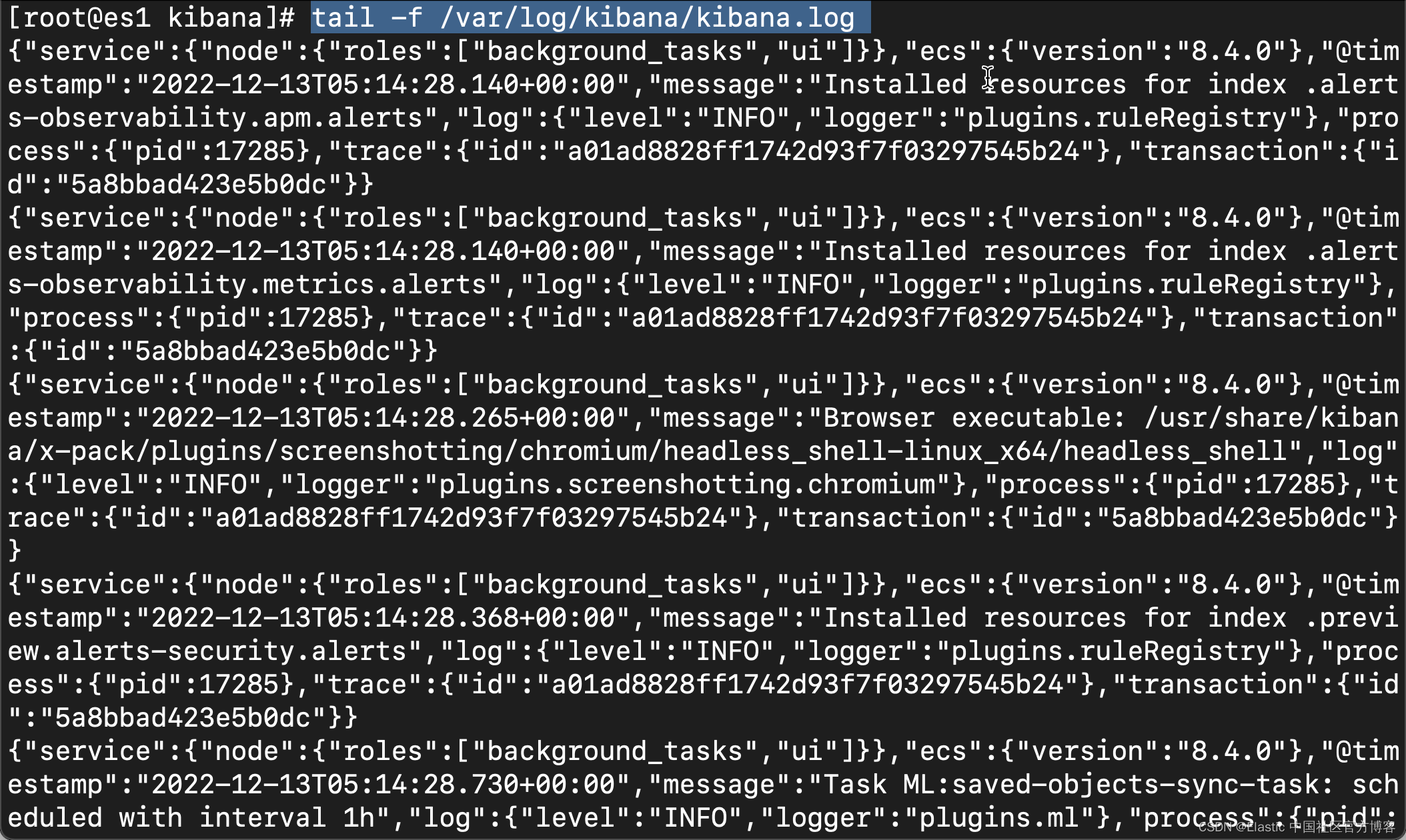 ● kibana.service - KibanaLoaded: loaded (/usr/lib/systemd/system/kibana.service; enabled; vendor preset: disabled)Active: active (running) since Tue 2022-12-13 05:14:09 UTC; 49s agoDocs: https://www.elastic.coMain PID: 17285 (node)CGroup: /system.slice/kibana.service└─17285 /usr/share/kibana/bin/../node/bin/node /usr/share/kibana/bin/../s...