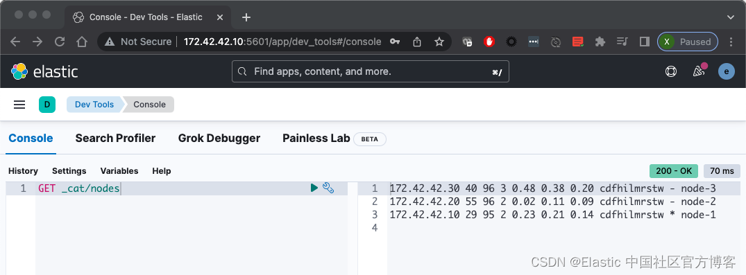 这样我们就进入到 Kibana 的界面了。我也可以在 console 中查看 nodes 的情况: