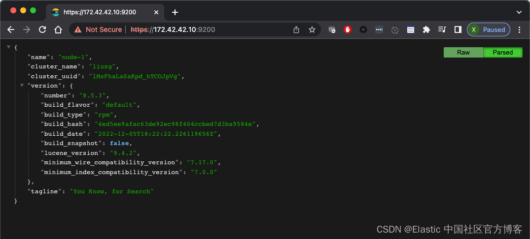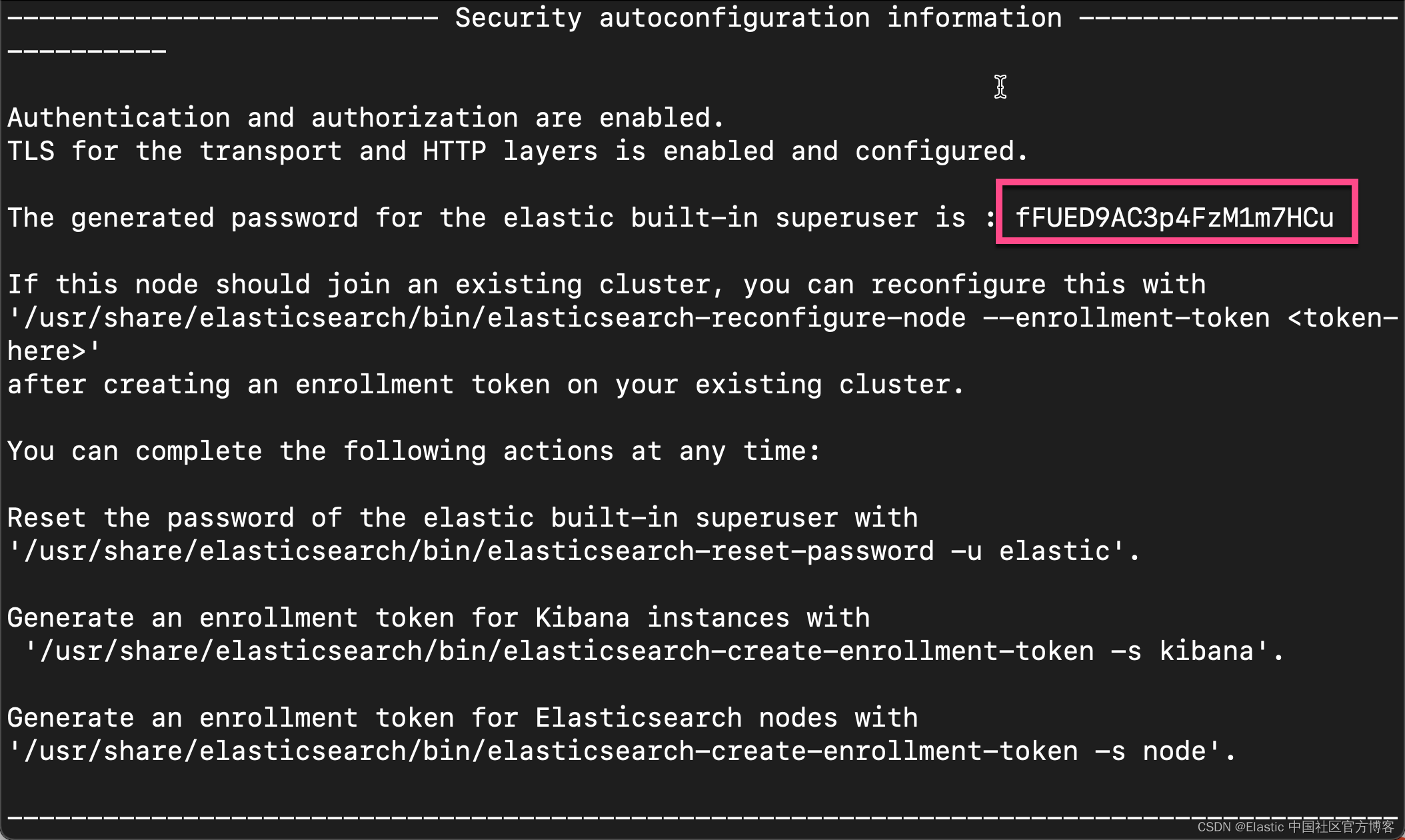 在安装的过程中,它会显示 elastic 超级用户的密码。我们可以把这个密码记下来。