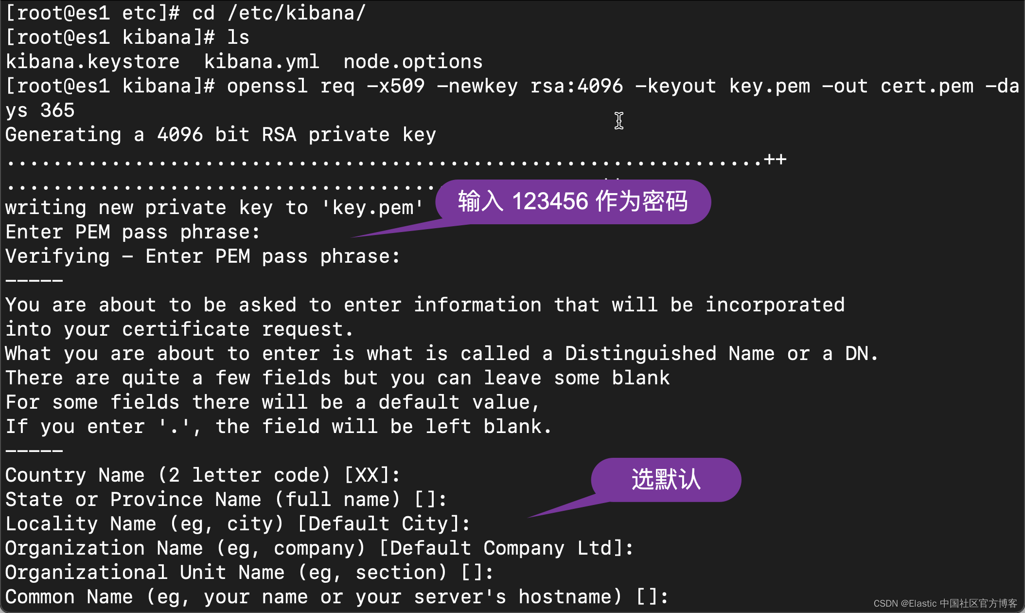 我们进入到 Kibana 的安装目录中 /etc/kibana,并打入如下的命令来生成一个证书: