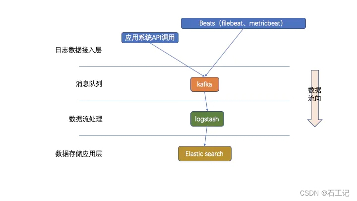 agent(指的是filebeat、metricbeat、auditbeat、API服务、logstash)收集需要提取的日志文件,包括syslog、nginx、tomcat、apache、windows event、snmptrap等,将日志转存到kafka集群中。logstash处理kafka日志,格式化处理,并将日志输出到elasticsearch中,前台页面通过grafana展示日志。