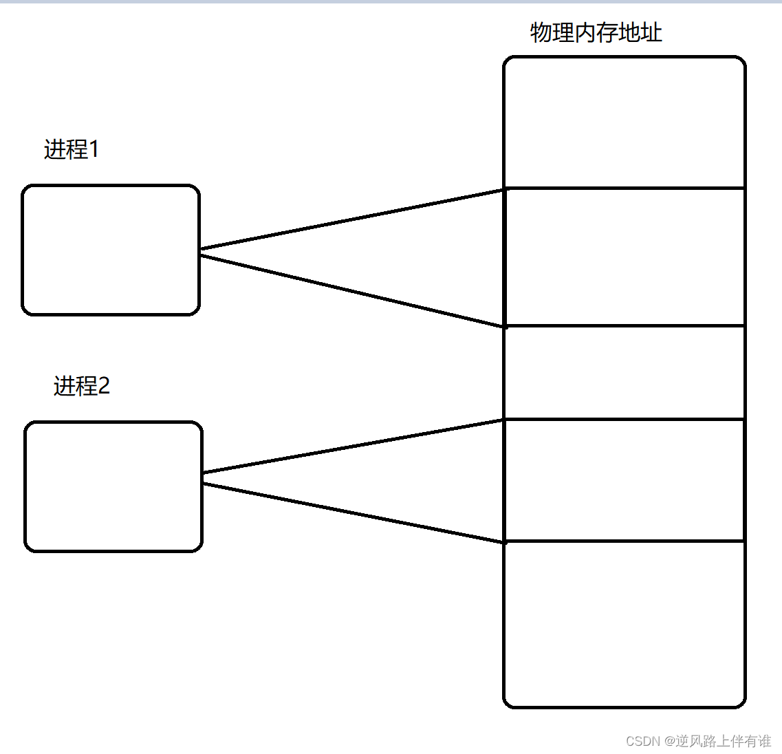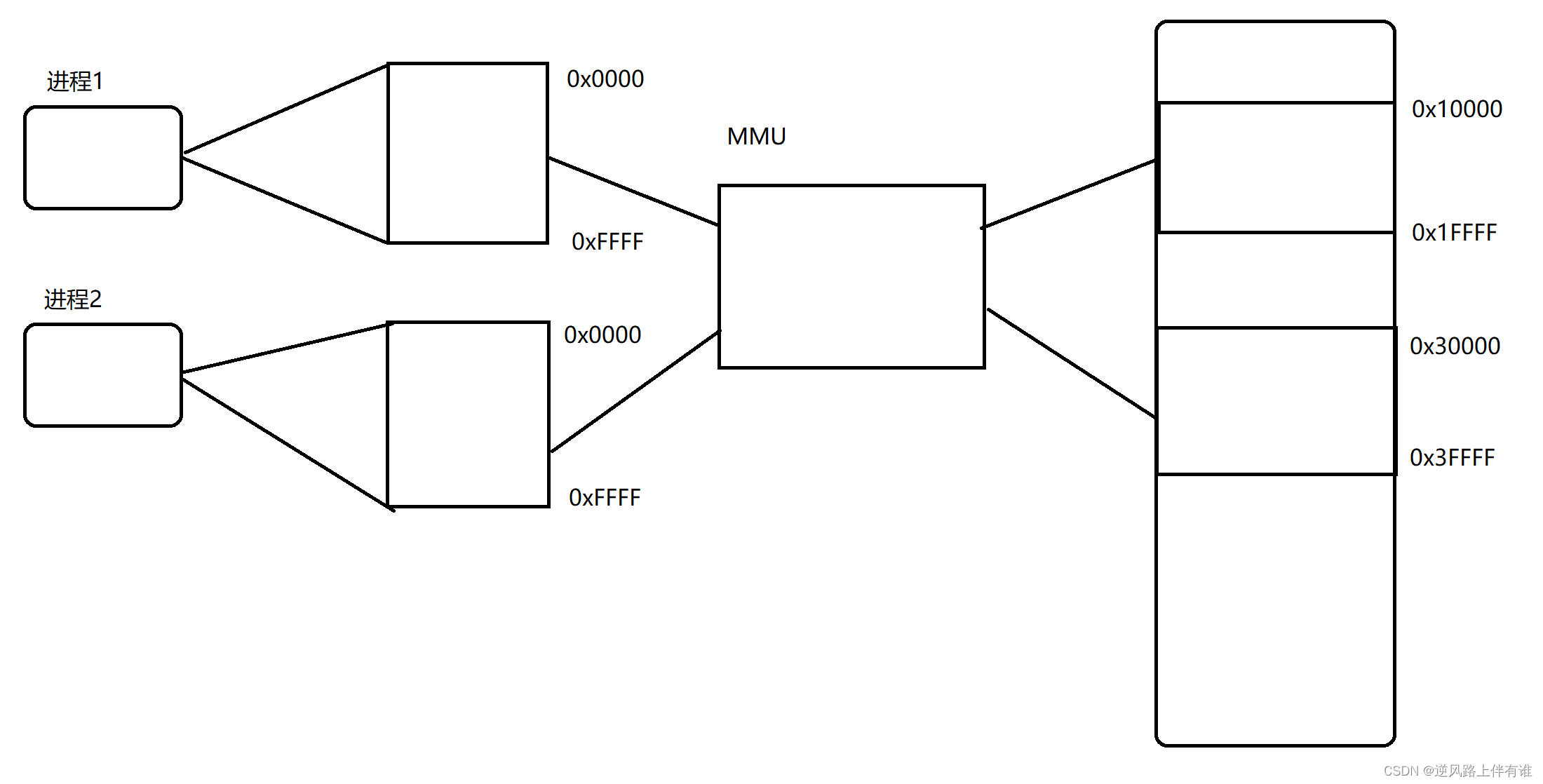 针对 进程1 和 进程2 来说,能够访问的内存空间,就只是0x0000-0xFFFF 这一段 如果不小心访问了更大的内存空间,在 MMU 映射的时候就能及时发现,从而避免对物理内存产生影响