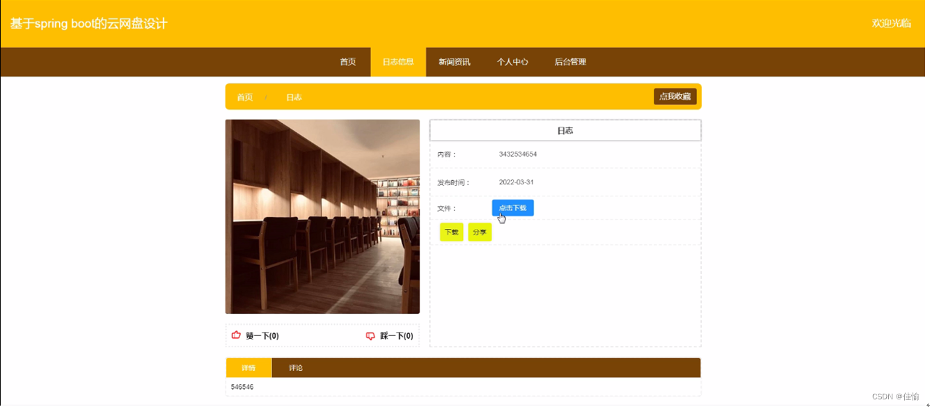 日志信息,用户可在日志信息页面查看标题、内容、图片、发布时间、文件等内容,还可进行赞、踩、评论、文件下载或收藏等操作,如图4-5所示。