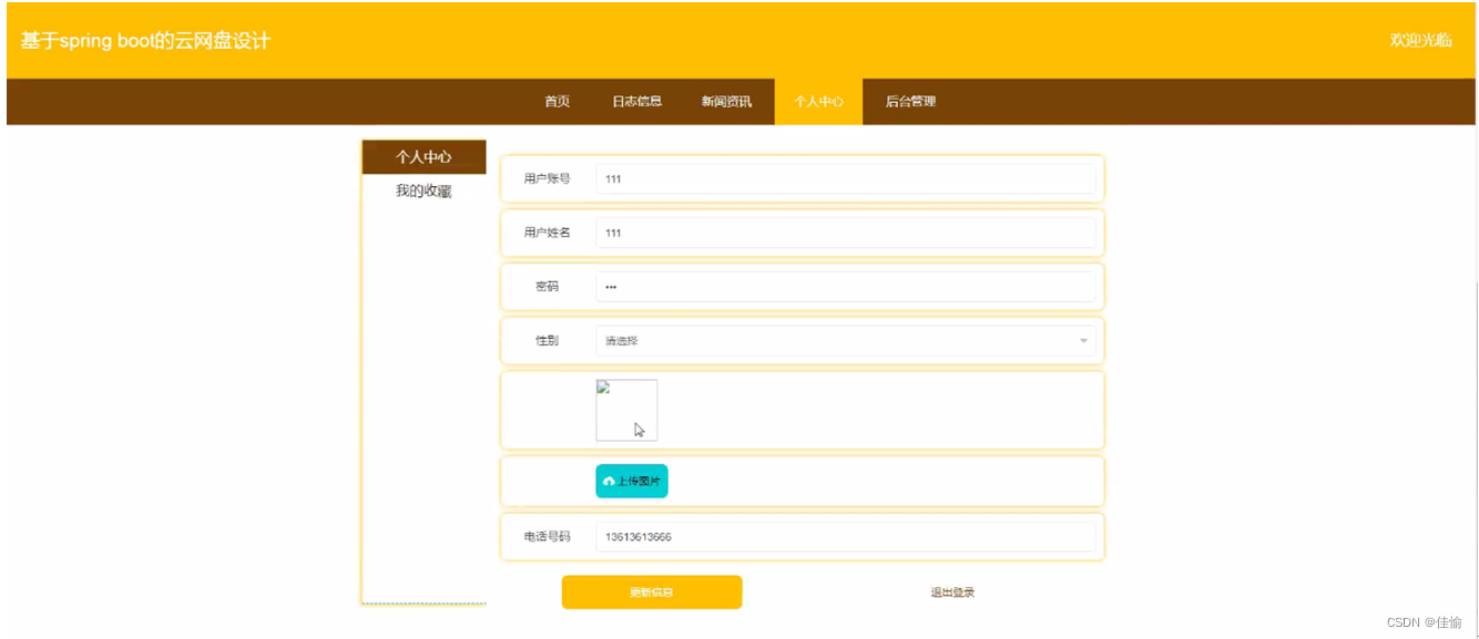 个人中心,用户可通过输入用户账号、密码、用户姓名、性别、上传图片、电话号码进行更新信息或查看我的收藏等内容,如图4-4所示。