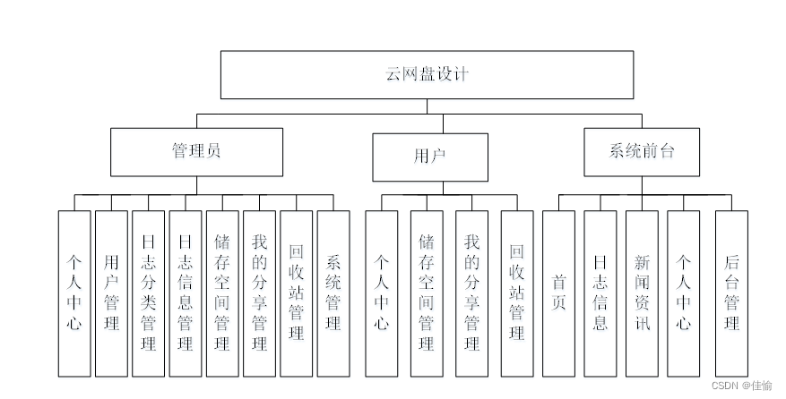后台主要是管理员,管理员功能包括个人中心、用户管理、日志分类管理、日志信息管理、储存空间管理、我的分享管理、回收站管理、系统管理等;系统对这些功能进行整合,产生的功能结构图如下: