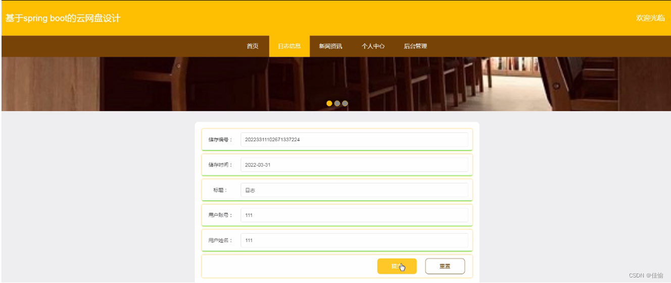 前台功能:用户进入系统可以实现首页、日志信息、新闻资讯、个人中心、后台管理等进行操作;