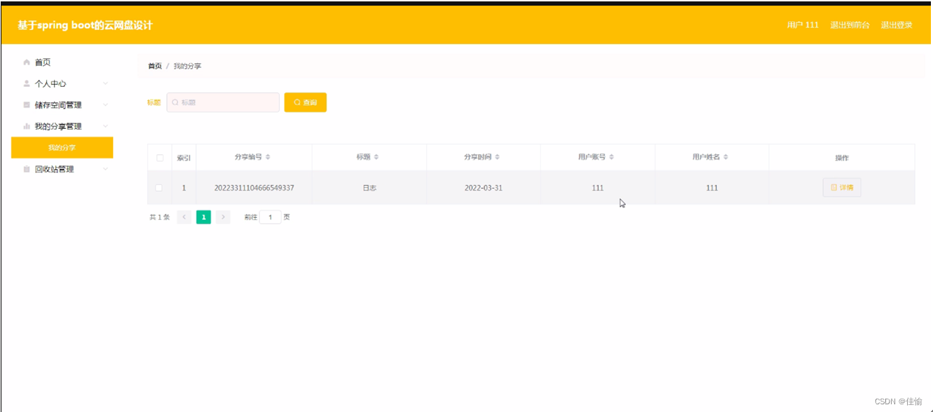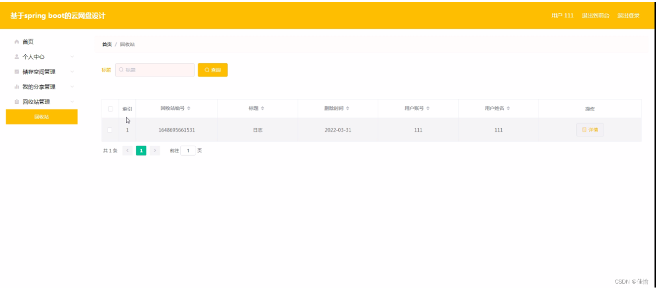 储存空间管理,用户可在储存空间管理页面查看储存编号、储存时间、标题、用户账号、用户姓名等内容,还可进行放入回收站等操作,如图4-8所示。