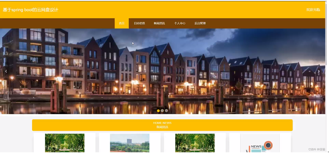 云网盘设计,用户进入到网站首页,可以查看首页、日志信息、新闻资讯、个人中心、后台管理等内容进行操作,如图4-1所示。