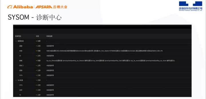 上图为SYSOM 诊断中心,负责检查调度、内存、IO网络、补丁 CPU 等,并针对问题进行告警。