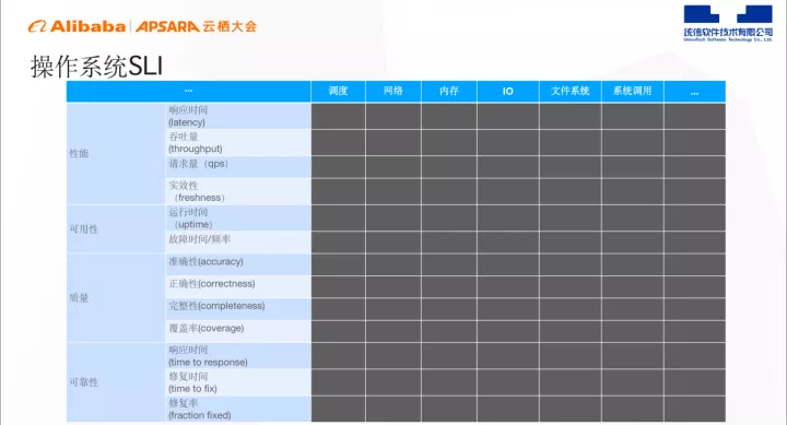 这里我们列了一个矩阵,Y轴是可靠性通用度量方法,X轴是系统的可观维度,通过X和Y轴的组合,可以生成操作系统的SLI度量项。