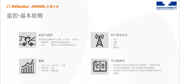 监控具有四个黄金信号,分别为延迟、流量、错误,饱和度。监控的工作内容应尽量简单,最常捕获真实事件的规则应尽可能简单、可预测和可靠,很少使用的数据收集、聚合和警报配置应被移除,已收集但未在任何仪表板中公开或被任何警报使用的信号应删除,方能达到高效分析问题的目的。