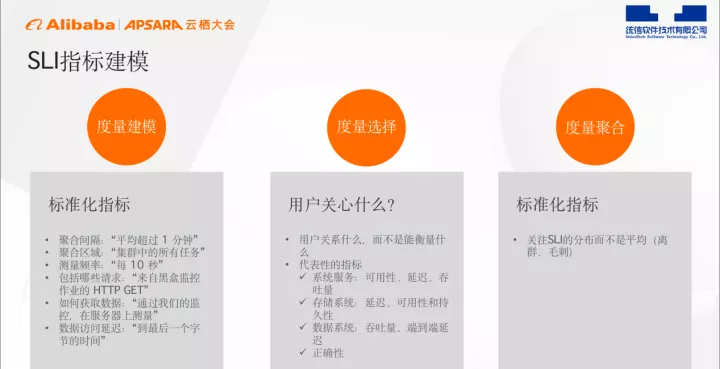 度量建模首先需要对指标进行标准化,比如聚合间隔、聚合区域、测量频率、包括哪些请求、如何获取数据以及数据访问延迟。进行度量选择时,应关注用户关心的内容,而不是能够衡量的内容。关注标准化指标时,需关注SLI分布而不是平均值。