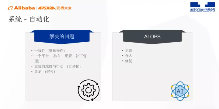 系统自动化能够解决一致性、一个平台、更快的维修与行动以及计划的问题,后续,我们也期待能够通过AI OPS实现智能识别、智能介入以及智能修复。