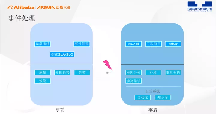 在事件处理中,需要在事件发生前做异常演练、趋势分析、告警等,在事件发生后及时呼叫相关工程师做根因分析,现场补救,进行错误修复。然后将补救经验沉淀到知识库,后续用于自动化修复。