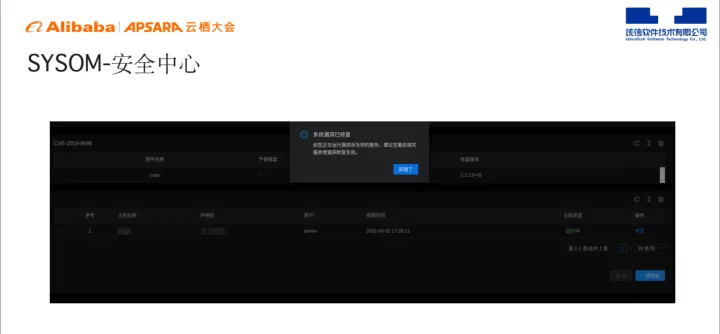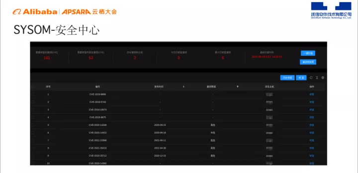 上图为SYSOM 安全中心,能够直观地为用户展示需要修复的漏洞数量、高危漏洞数量、修复漏洞影响的主机数量、今天修复的数量、累计修复的数量等。安全中心既能支持多个漏洞批量修复,也支持多个主机漏洞批量修复,可以一次性将所有主机的所有漏洞进行修复。