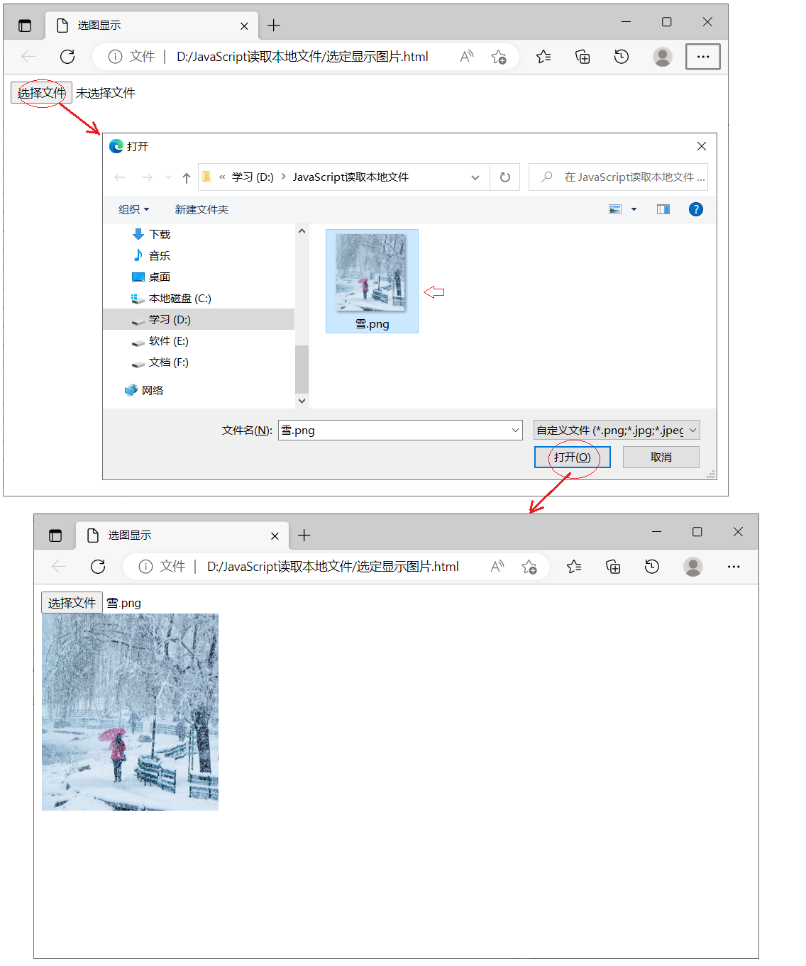 例子中,使用file 类型的输入字段来选择所需的文件。使用