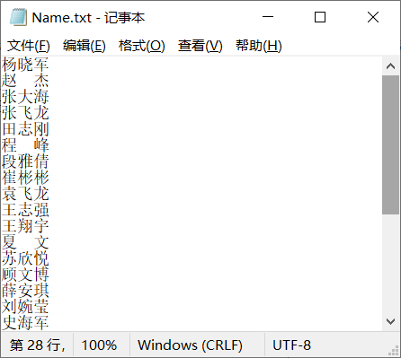 下面给出的随机点名的例子,可从文本文件中读入人员名单,请准备人员名单文本文件,每人占一行,如:
