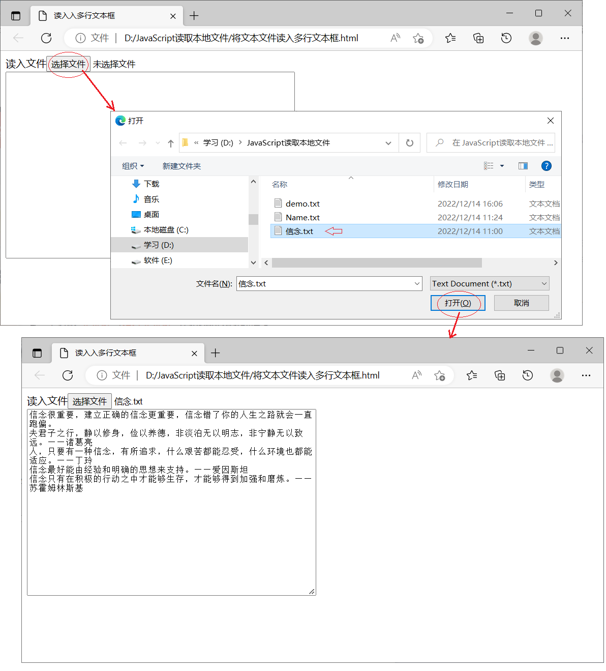读入入多行文本框 读入文件保存文件名为:将文本文件读入多行文本框.html,用浏览器打开显示效果如下: