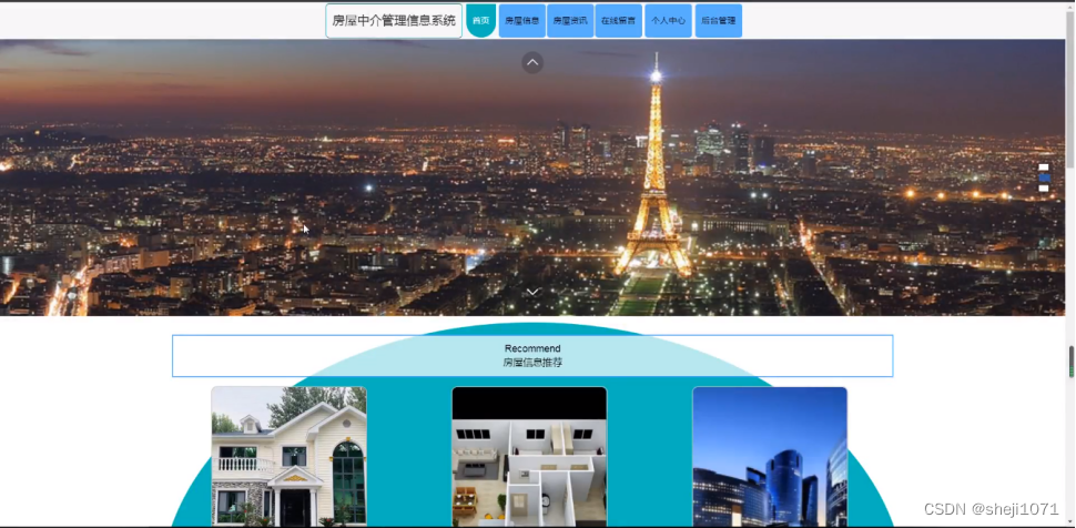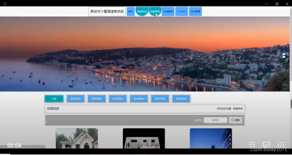 房屋中介管理信息系统,在系统首页可以查看首页、房屋信息、房屋资讯、在线留言、个人中心、后台管理等内容,并进行详细操作;如图5-1所示。