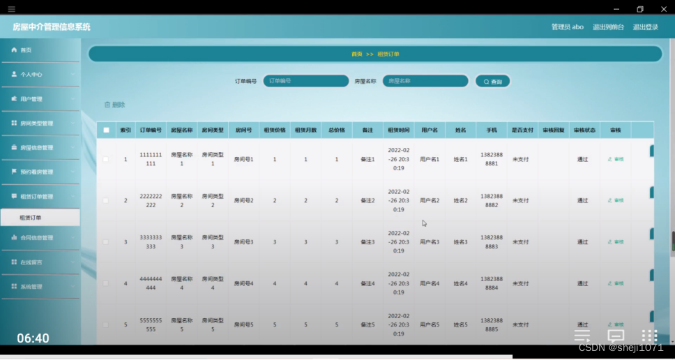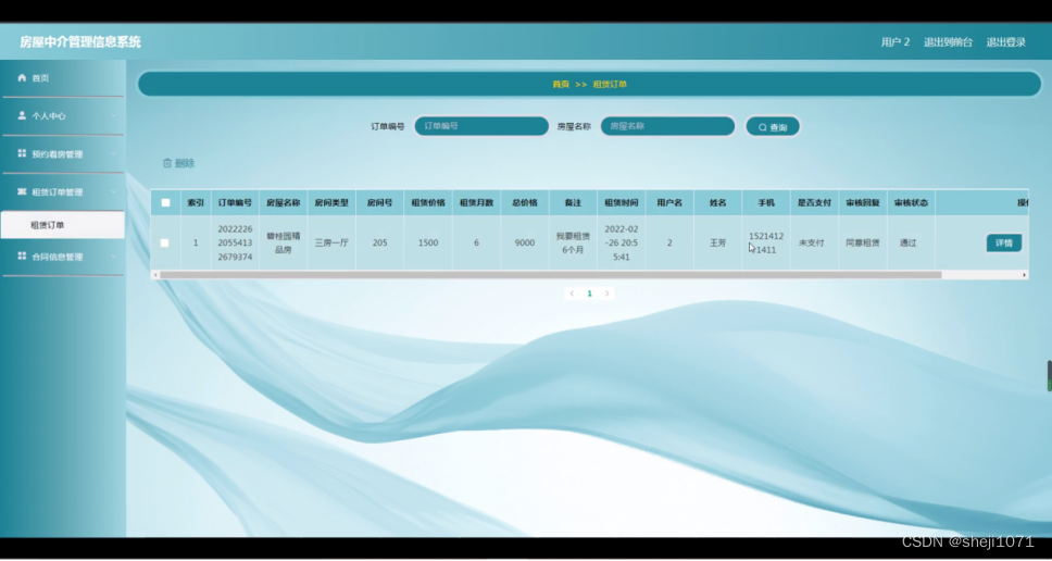 租赁订单管理,在租赁订单管理页面可以对索引,订单编号,房间名称,房间号,房间类型,租赁价格,租赁月数,总价格,备注,租赁时间,用户名,姓名,手机,是否支付,审核回复,审核状态等内容进行详情,合同,修改和删除操作,如图5-10所示。