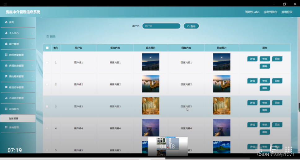 预约看房管理,在预约看房管理页面可以对索引,房间名称,房间号,房间类型,预约内容,预约时间,用户名,姓名,手机,审核回复,审核状态等内容进行详情,修改,和删除操作,如图5-9所示。