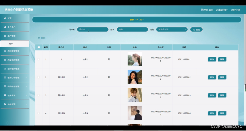 用户管理,在用户管理页面可以对索引,用户名,姓名,性别,头像,身份证,手机等内容进行修改和删除操作,如图5-6所示。