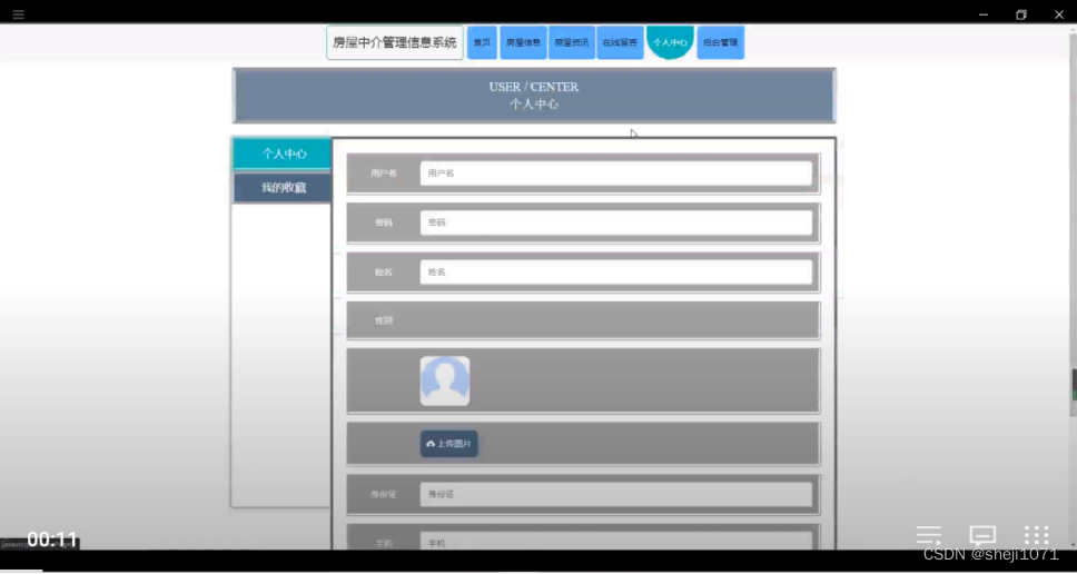 个人中心,在个人中心页面通过填写个人用户名、密码、姓名、性别、身份证、手机号码、上传图片等内容进行更新信息,如图5-3所示。