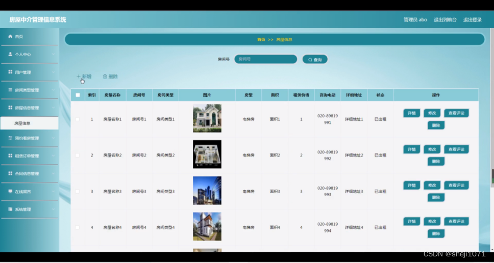 房屋信息管理,在房屋信息管理页面可以对索引,房间名称,房间号,房间类型,图片,房型,面积,租赁价格,咨询电话,详细地址等内容进行详情,修改,查看评论和删除操作,如图5-8所示。