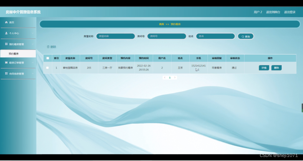 预约看房管理,在预约看房管理页面可以对房间名称,房间号,房间类型,预约内容,预约时间,用户名,姓名,手机,审核回复,审核状态等内容进行详情和删除操作,如图5-13所示。