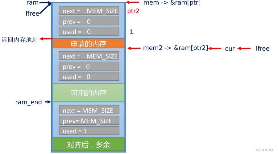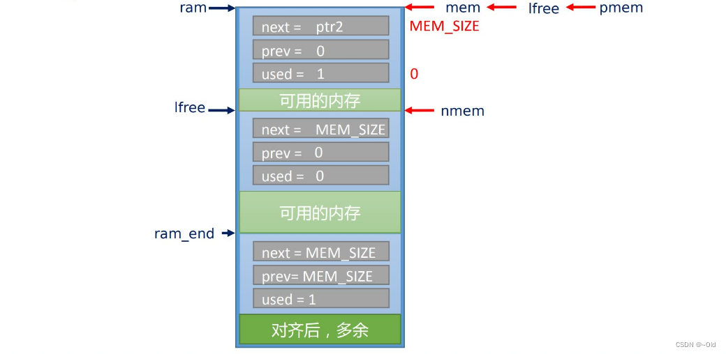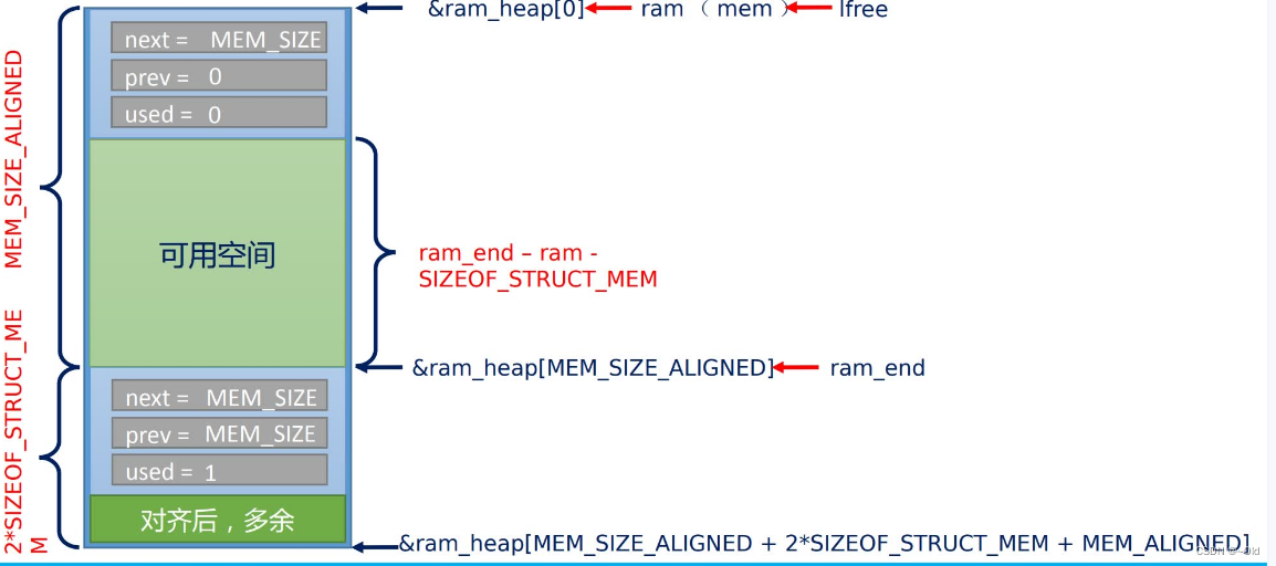 {struct mem *mem;LWIP_ASSERT("Sanity check alignment",(SIZEOF_STRUCT_MEM & (MEM_ALIGNMENT - 1)) == 0);/* 对内存堆的地址(全局变量名)进行对齐指向ram_heap */ram = (u8_t *)LWIP_MEM_ALIGN(LWIP_RAM_HEAP_POINTER);/* 建立第一个内存块,内存块由内存块头+空间组成 */mem = (struct mem *)(void *)ram;/* 下一个内存块不存在,因此指向内存堆的结束 */mem->next = MEM_SIZE_ALIGNED;/*前一个内存块就是它自己,因为这是第一个内存块*/mem->prev = 0;/*第一个内存块没有被使用*/mem->used = 0;/*初始化堆的末端(指向MEM_SIZE_ALIGNED底部位置)*/ram_end = ptr_to_mem(MEM_SIZE_ALIGNED);/*最后一个内存块被使用,因为其后面没有可用的空间,必须标记为已被使用*/ram_end->used = 1;/*下一个不存在,因此指向内存堆的结束*/ram_end->next = MEM_SIZE_ALIGNED;/*前一个不存在,因此指向内存堆的结束*/ram_end->prev = MEM_SIZE_ALIGNED;MEM_SANITY();/*已释放的索引最小的内存块就是上面建立的第一个内存块*/lfree = (struct mem *)(void *)ram;MEM_STATS_AVAIL(avail, MEM_SIZE_ALIGNED);/*这里建立一个互斥信号量,主要是用来进行内存的申请、释放的保护*/if (sys_mutex_new(&mem_mutex) != ERR_OK) {LWIP_ASSERT("failed to create mem_mutex", 0);}