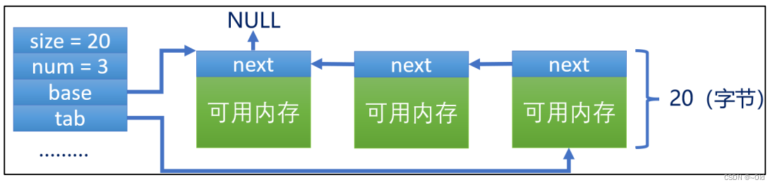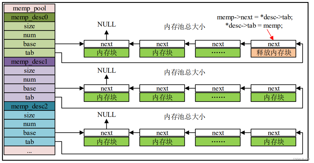 #endif/* 将内存块链接成链表形式 */for (i = 0; i < desc->num; ++i) {memp->next = *desc->tab;*desc->tab = memp;