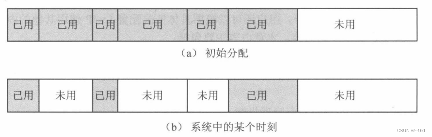 在系统运行于某个时刻,内存的组织如图所示,如果此时用户又提出内存空间申请,那么内存分配函数又将怎样去做呢?通常可以分为两种类型:一种是系统继续从高地址的空闲块中进行分配,而不去理会已经分配给用户的内存区域是否已被释放,当分配无法进行时(即高地址空间不能满足用户请求的大小时),系统才去逐渐地检查以前分配给用户的空间是否已释放,同时系统将所有已释放的空间重新组织成-一个大的可用空闲块,以满足用户的内存分配请求;另一种策略是一旦用户运行结束并释放内存空间,系统便将该空间标记为空闲,每当有用户提出空间分配申请时,系统将依次遍历整个系统中的空闲块,找出一个系统认为可 每当有用户提出空间分配申请时,系统将依次遍历整个系统中的空闲块,找出一个系统认为可行的空闲块给用户。这里最常见的是第二种策略,这种类型的分配方式又可以衍生出好几种内存分配策略。