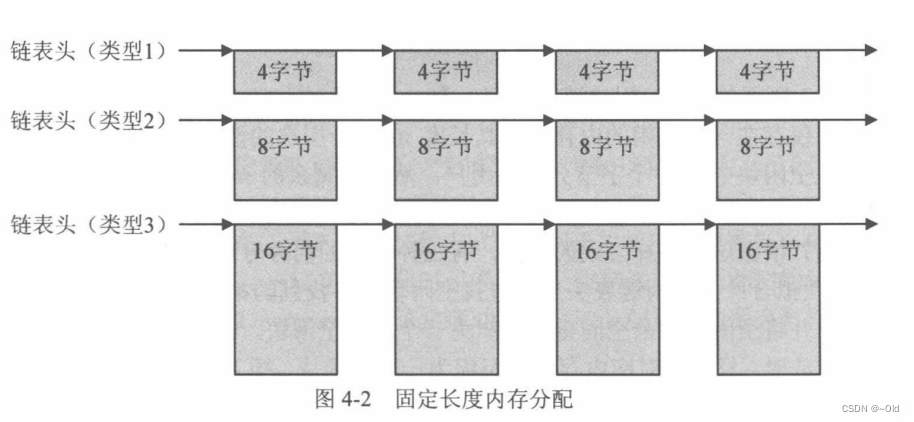第一种:系统规定用户在申请内存时,申请大小必须指定为某几个固定值(例如4、8、16等)否则内存分配函数不予分配。系统初始化时,会事先在内存中初始化相应的空闲内存块空间,如图所示,系统将所有可用区域以固定大小为单位进行划分,然后用一个简单的链表将所有空闲块链接起来。由于链表中所有节点的大小相同,所以分配时不需要查找,直接取出第一个节点中的空间分配给用户即可,同样,内存释放过程也很简单,直接将释放的内存空间插入到对应链表首部即可。通常,这种分配方式内存所需的时间很短,效率也很高。但这种方式使用时比较拘束,因为用户申请的大小必须为某个固定长度,所以这种方式不可避免的会产生内存浪费的现象,以及在申请大内存时有可能出现申请不成功的情况。在LwIP中实现了这种方式的内存分配策略,称之为动态内存池分配,这种方式可以用来对某种固定的数据结构进行空间的分配(如TCP首部,IP首部等)。