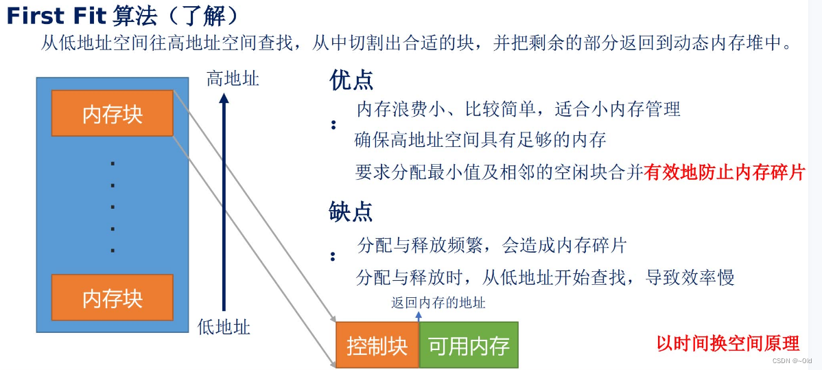从空闲链表头开始查找空闲块,将找到的第一个长度不小于n的空闲块分配给用户,并将空闲块剩余空间重新组织为一个小的空闲块,插入到链表中。这种策略下, 在内存空间释放时,只需将对应内存空间组织为-一个空闲块,插入到空闲链表表头即可。首次拟合是目前使用最多的内存分配策略,在LwIP中也提供了这种内存分配策略的实现,称之为内存堆分配。