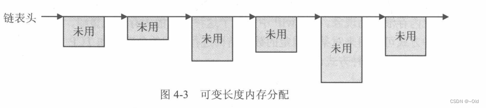 第三种:这种方式是在很多系统中被用到的。系统运行时,各个空闲块的大小是随着系统运行而改变的,系统分配给用户的空间大小随着用户请求的大小而改变,系统刚开始时,整个内存空间就是一个大的空闲块,随着分配和回收的进行,内存块的大小、数量也随着系统的运行而改变,某个时刻内存中空闲块的组织示意图如下所示: