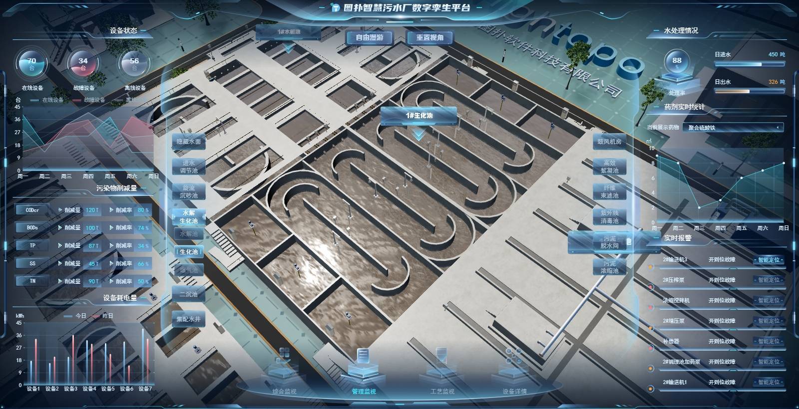 图扑软件搭建的污水处理厂可视化项目,对现场设备设施及工艺流程中的实际运行采集的数据进行可视化展示,当发生异常情况可以即时、准确地将报警,调度中心的管理运行人员根据工艺段、设备等的报警情况进行统计和智能报警综合分析,为管理决策提供支持,实现远程掌控污水厂运行情况,提高工作效率。