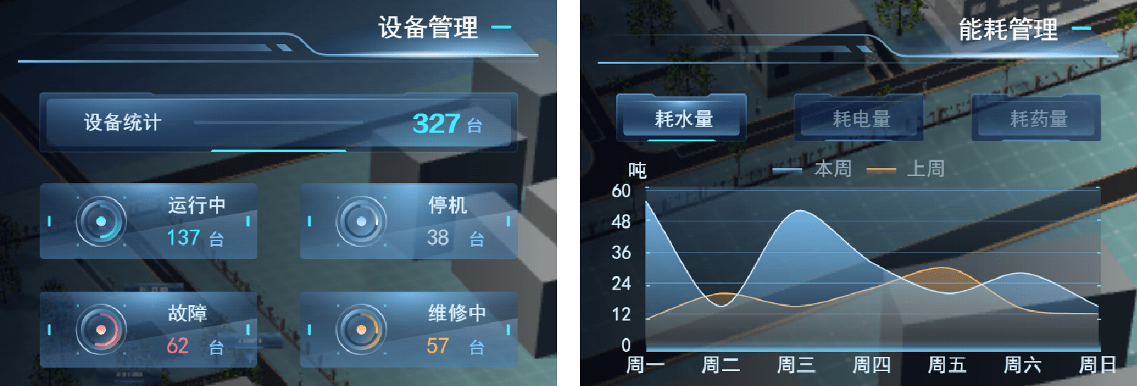 画面两侧数据面板展示厂区设备运维的能耗、运营成本、实时报警、街道供水量等关键指标参数,将采集的数据信息转化为相应的图形信息,直观的展示全厂各工艺流程段的实时设备工况,使管理人员及时掌握水厂运行情况。