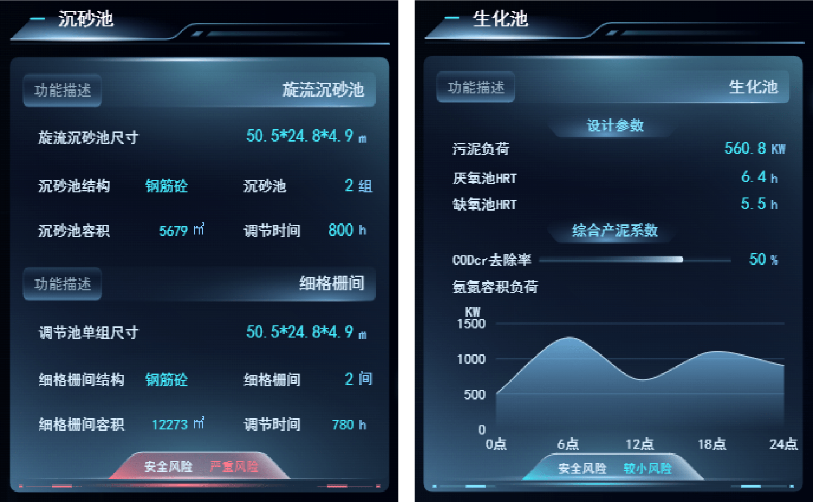 设备详情页面,是对水厂重点工艺段的建设参数、功能描述、风险等级等数据进行展现。