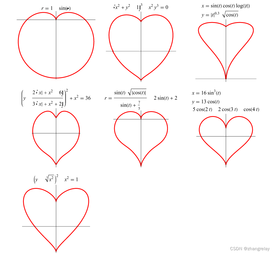 有许多数学曲线可以产生心形,其中一些在上面进行了说明。“第零”曲线是由极性方程给出的旋转心形(其名称的意思是“心形”)