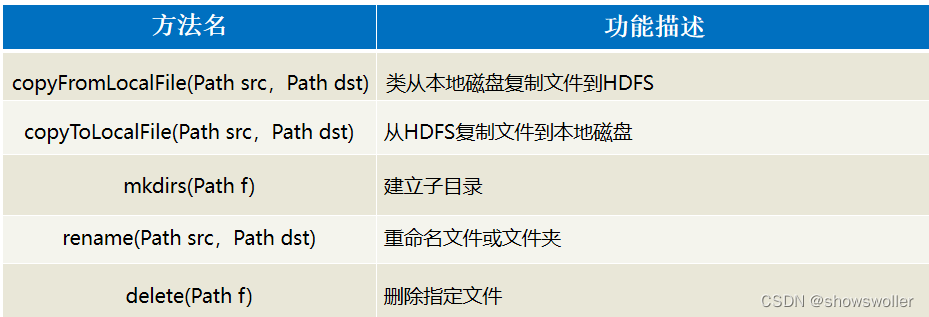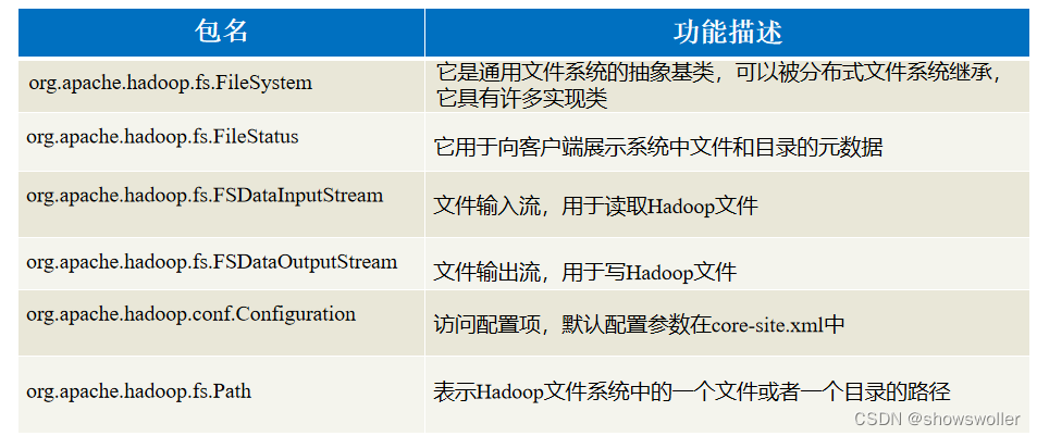 Configuration:该类的对象封装了客户端或者服务器的配置,Configuration实例会自动加载HDFS的配置文件core-site.xml,从中获取Hadoop集群的配置信息。