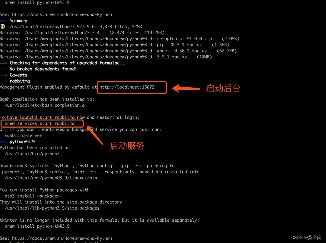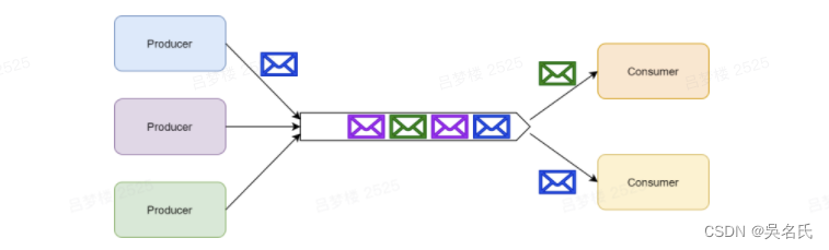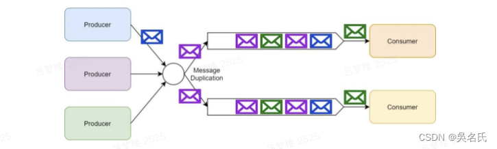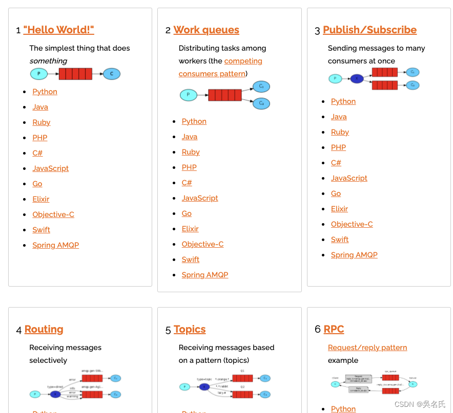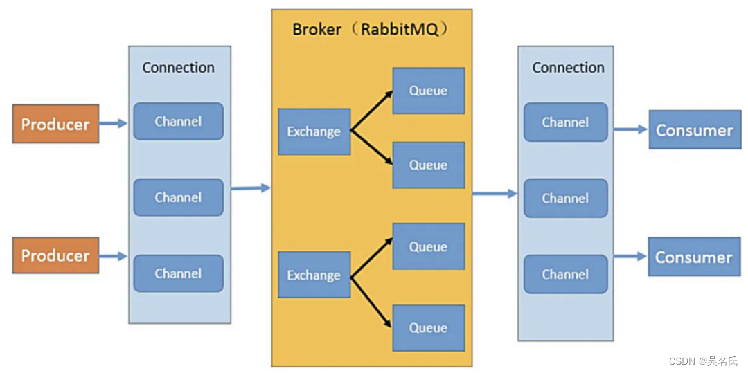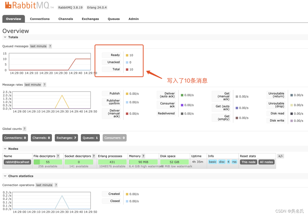 public class RabbitMqTest {//消息队列名称private final static String QUEUE_NAME = "hello";@Testpublic void send() throws java.io.IOException, TimeoutException {//创建连接工程ConnectionFactory factory = new ConnectionFactory();factory.setHost("127.0.0.1");factory.setPort(5672);factory.setUsername("admin");factory.setPassword("admin");//创建连接Connection connection = factory.newConnection();//创建消息通道Channel channel = connection.createChannel();//生成一个消息队列channel.queueDeclare(QUEUE_NAME, true, false, false, null);for (int i = 0; i < 10; i++) {String message = "Hello World RabbitMQ count: " + i;//发布消息,第一个参数表示路由(Exchange名称),为""则表示使用默认消息路由channel.basicPublish("", QUEUE_NAME, null, message.getBytes());System.out.println(" [x] Sent '" + message + "'");}//关闭消息通道和连接channel.close();connection.close();}@Testpublic void consumer() throws java.io.IOException, TimeoutException {//创建连接工厂ConnectionFactory factory = new ConnectionFactory();factory.setHost("127.0.0.1");factory.setPort(5672);factory.setUsername("admin");factory.setPassword("admin");//创建连接Connection connection = factory.newConnection();//创建消息信道final Channel channel = connection.createChannel();//消息队列channel.queueDeclare(QUEUE_NAME, true, false, false, null);System.out.println("[*] Waiting for message. To exist press CTRL+C");DeliverCallback deliverCallback = (consumerTag, delivery) -> {String message = new String(delivery.getBody(), "UTF-8");System.out.println(" [x] Received '" + message + "'");};channel.basicConsume(QUEUE_NAME, true, deliverCallback, consumerTag -> {});}