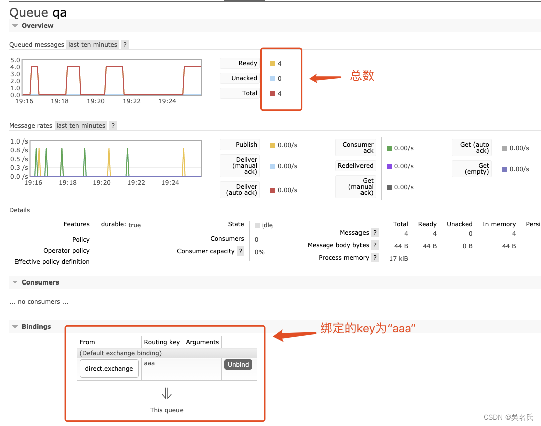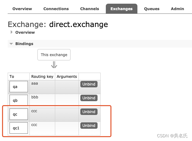 public class DirectConsumer {private static final String exchangeName = "direct.exchange";public void msgConsumer(String queueName, String routingKey) {try {MsgConsumer.consumerMsg(exchangeName, queueName, routingKey);} catch (IOException e) {e.printStackTrace();} catch (TimeoutException e) {e.printStackTrace();}}public static void main(String[] args) throws InterruptedException {DirectConsumer consumer = new DirectConsumer();String[] routingKey = new String[]{"aaa", "bbb", "ccc"};String[] queueNames = new String[]{"qa", "qb", "qc"};for (int i = 0; i < 3; i++) {consumer.msgConsumer(queueNames[i], routingKey[i]);}Thread.sleep(1000 * 60 * 100);}