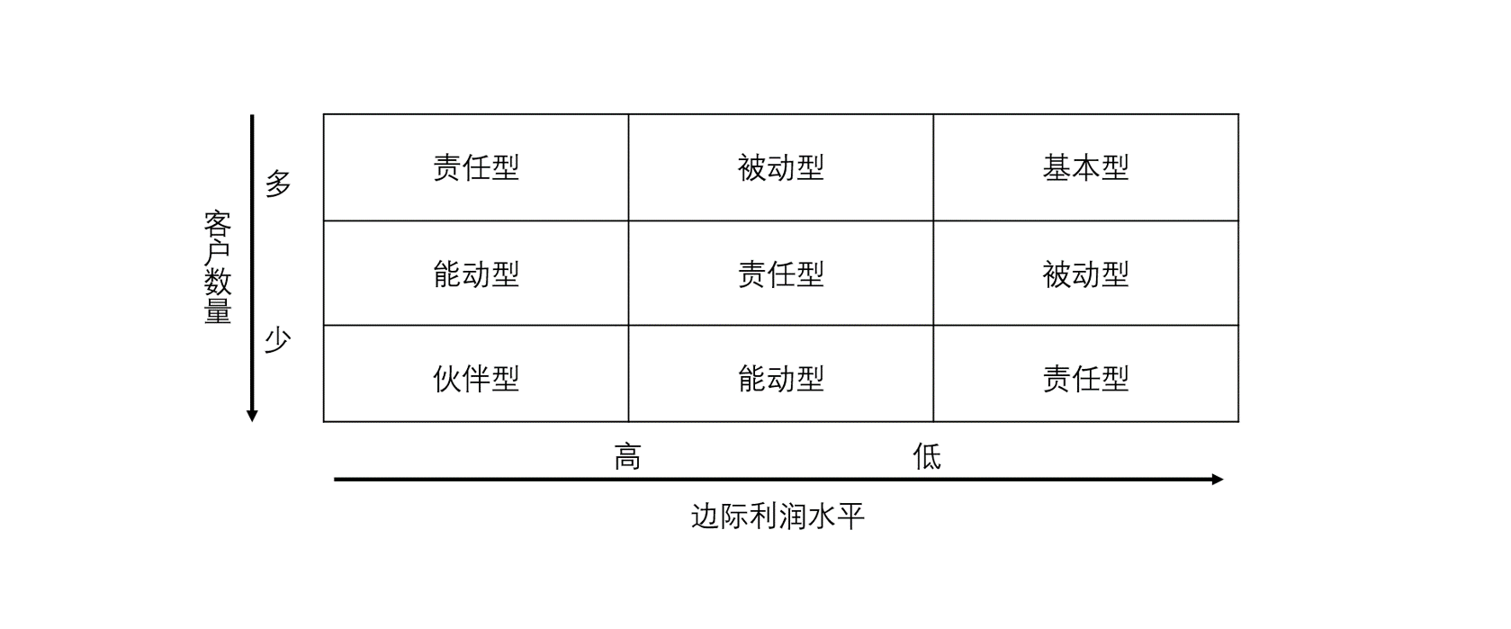 科特勒根据客户数量与产品的边际利润水平提供了一个表格来帮助企业选择自己与客户的关系类型,从而对客户进行有效的划分。