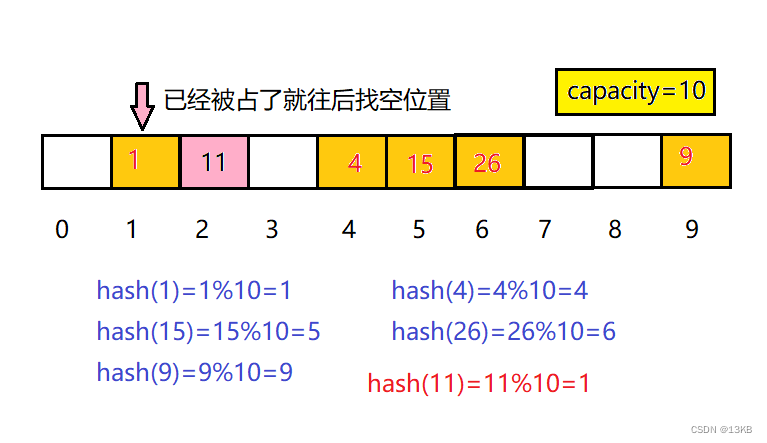 hash(11)=11%10+0*2=1,但是1的位置被占了,所以变成hash(11)+1*2,如果这个位置是空的就放进去,不是的话,i继续加。